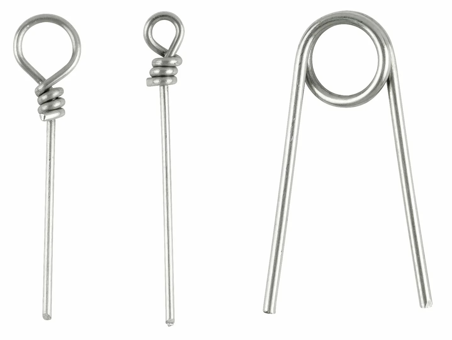 3 soorten RVS pinnetjes waarmee de rig in de softbait bevestigd wordt. De pinnetjes met dubbele pootjes zijn uitermate geschikt om een buikdreg mee te fixeren in de softbait. De enkelpoots pinnetjes zijn gemaakt om te gebruiken met kleinere softbaits en bij staartmontages (zodat je de staartactie zo min mogelijk beïnvloedt). De pinnetjes kunnen soepel in de softbait gedrukt worden en houden de rig netjes op zijn plek tijdens het vissen.